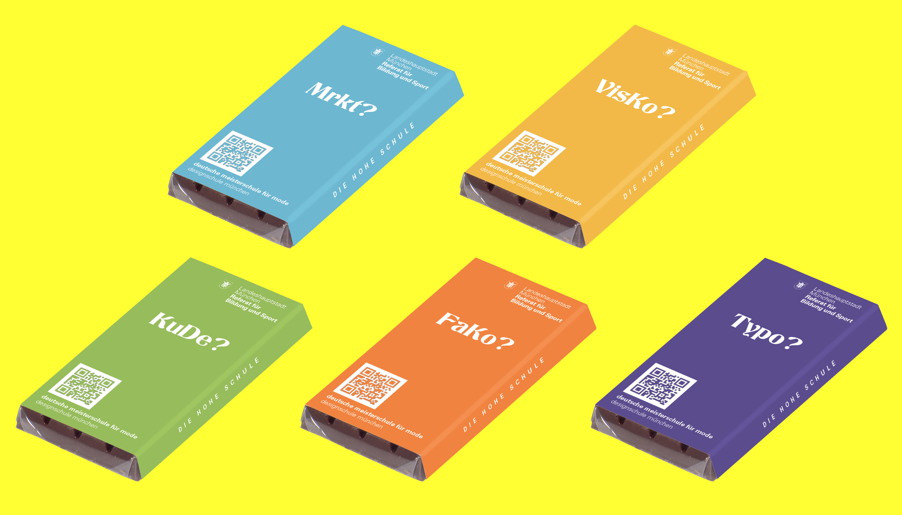 Anstatt Aufschluss über Inhaltsstoffe der Schokolade zu geben, zeigt die Rückseite, was sich hinter den hohen Fassaden der Designschule verbirgt. Sie enthält Angaben über das breite Fächerangebot und gibt einen Überblick über die vertraute Atmosphäre im Schulgebäude.