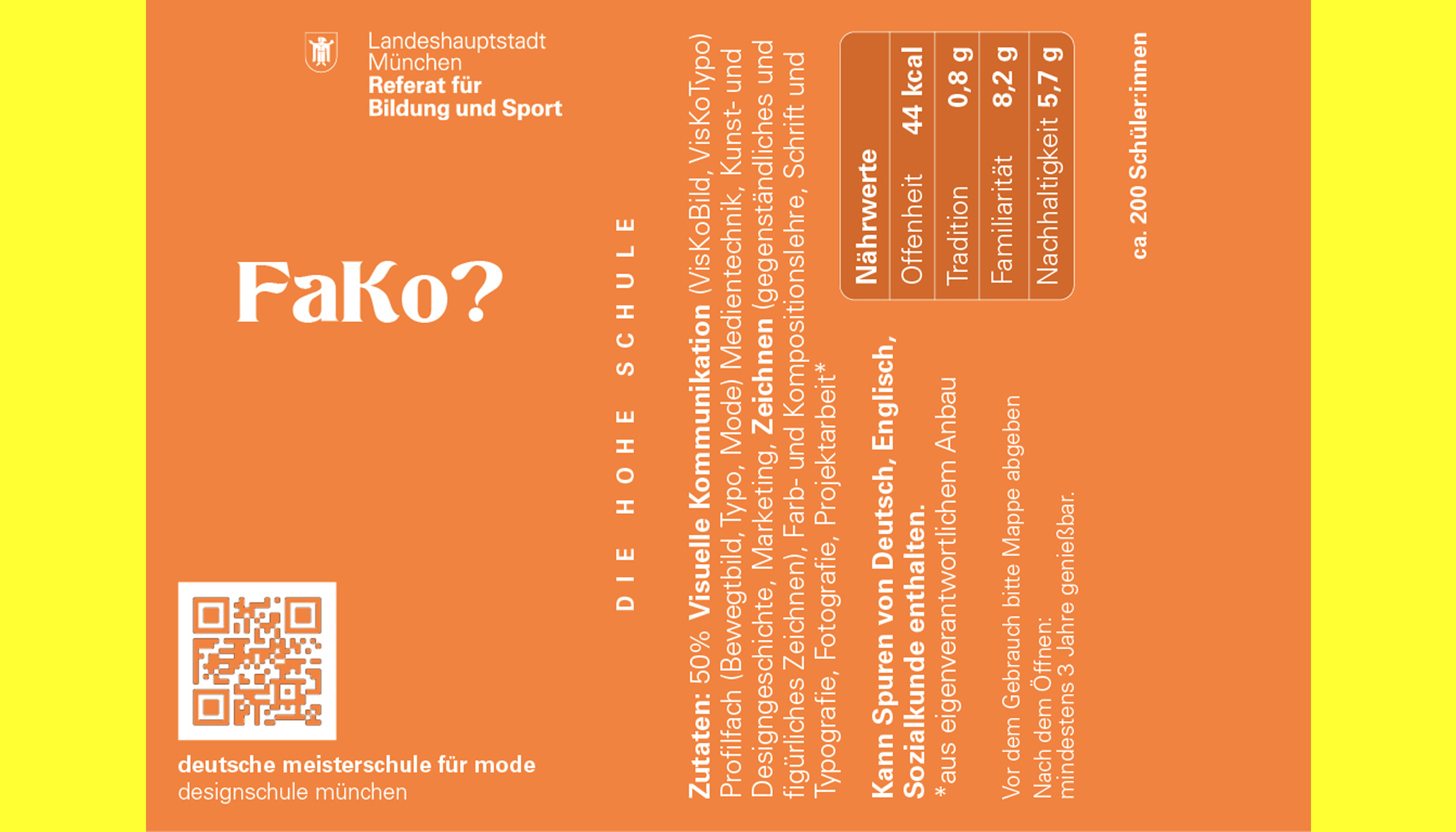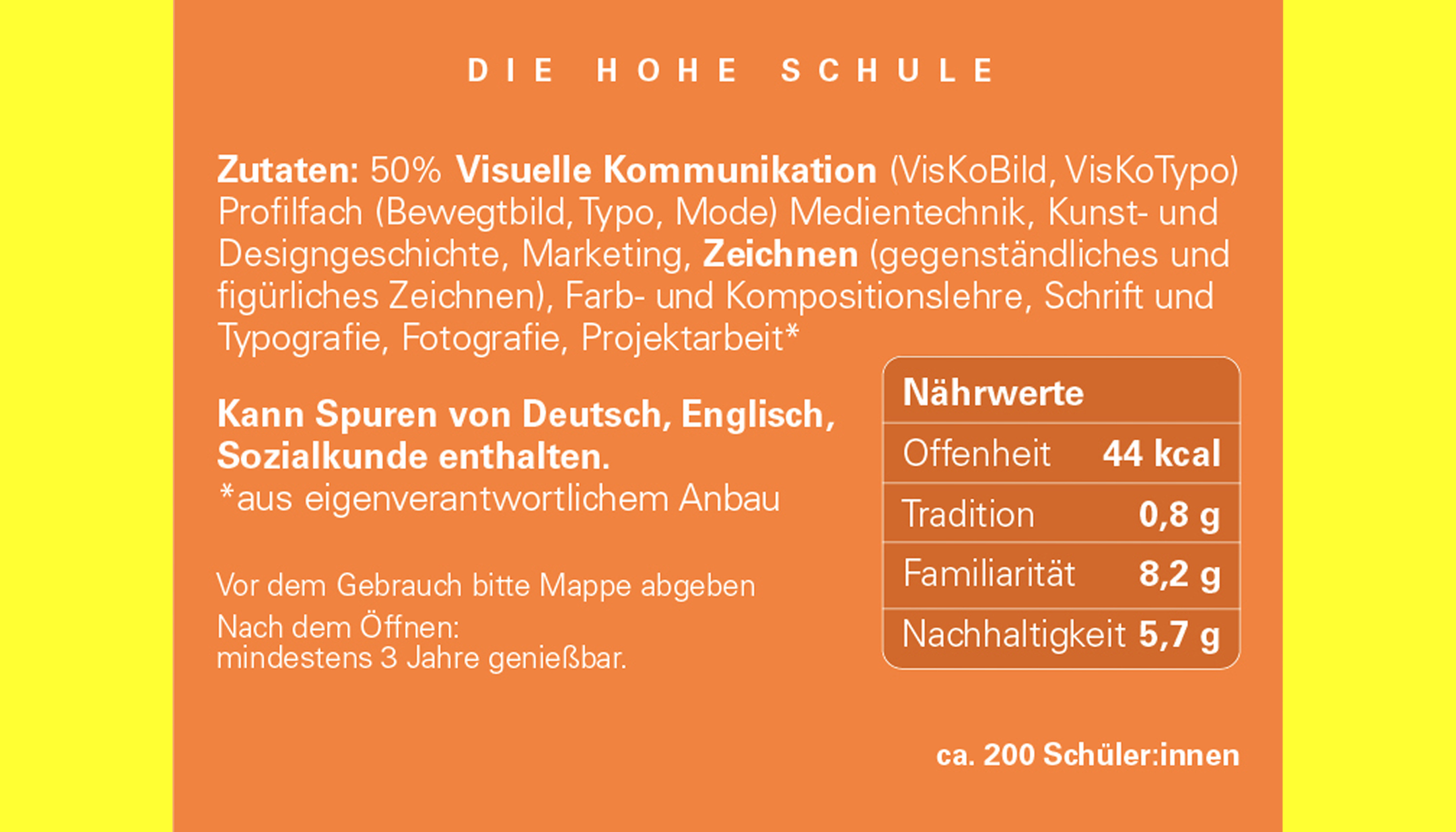 Bei der Entwicklung des Verpackungsdesigns arbeiten wir mit dem Look einer typischen Inhaltsangabe/Nährwertetabelle und geben einen ersten Einblick in den Alltag der Designschule München mit ihren Fachrichtungen.