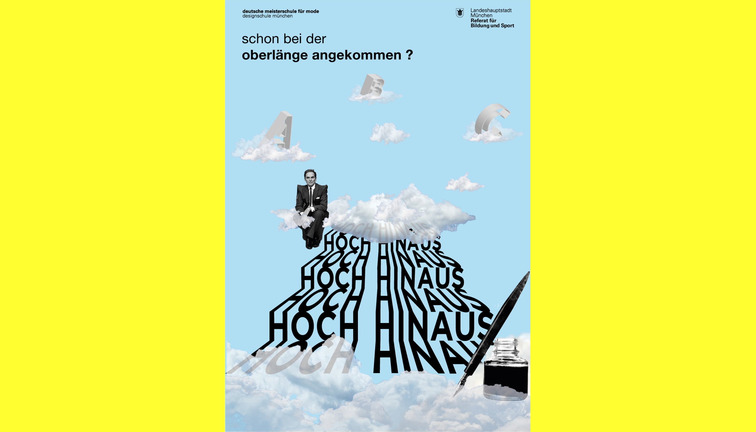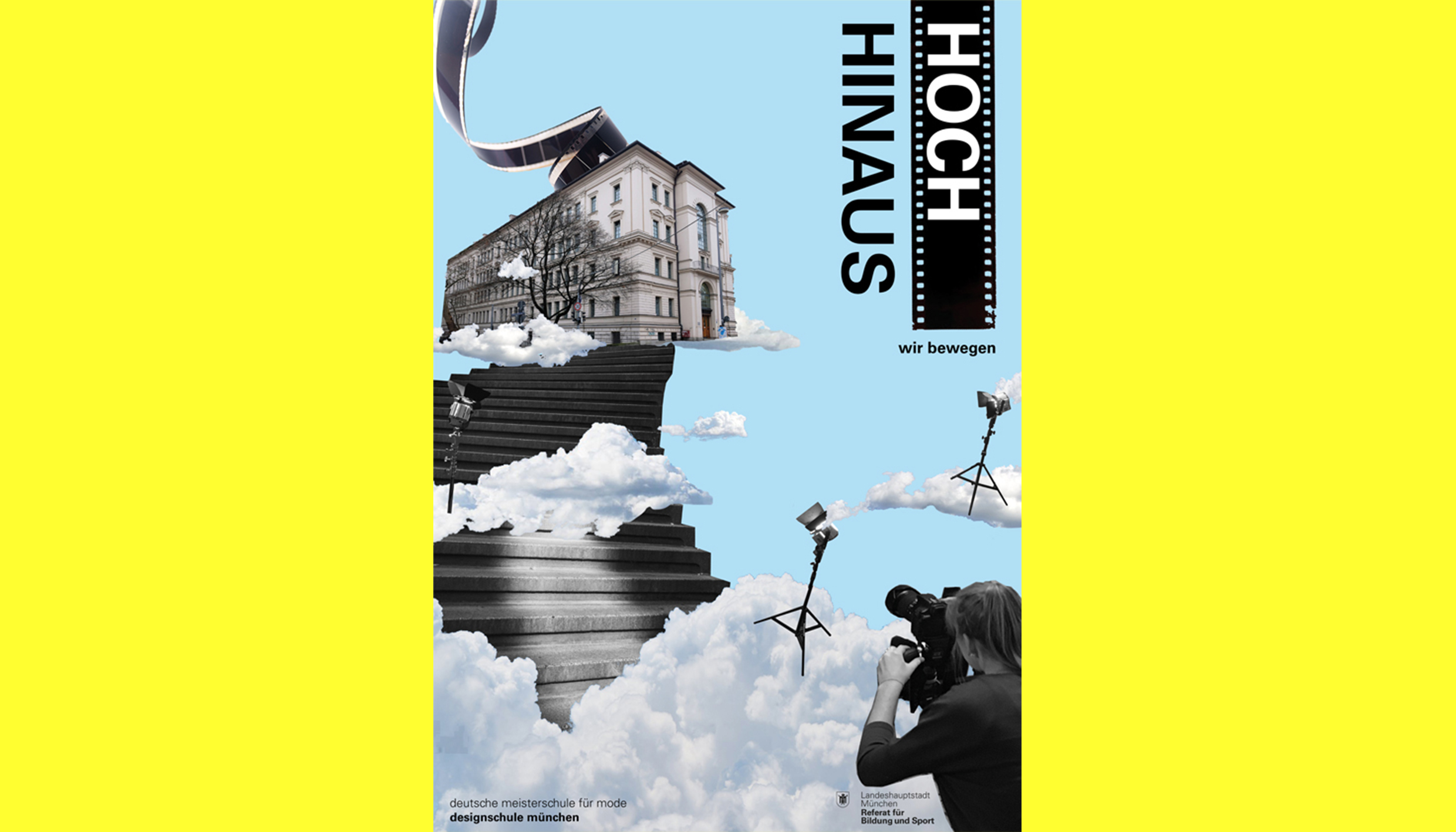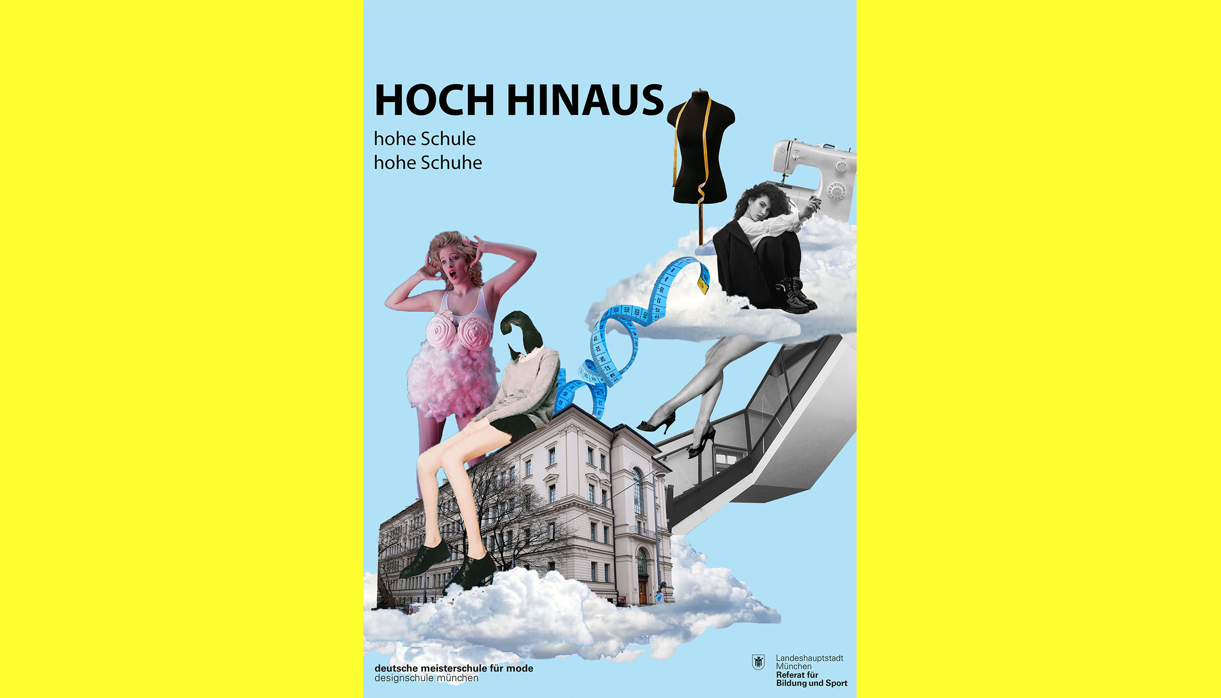 Mit der Plakatserie „HOCH HINAUS“ wird auf verschiedene Aspekte unseres Leitbildes angespielt. Unsere Schule wird hoch oben in den Wolken dargestellt, was die Kernaussage unterstreicht, dass wir die „hohe Schule“ mit Hochschulniveau sind. Es ist ein Ort der Träume wahr werden lassen soll: Nämlich der Traum die Leidenschaft des Gestaltens zum Beruf zu machen, die Karriereleiter hochzuklettern und Stufe für Stufe ein besserer Designer zu werden.