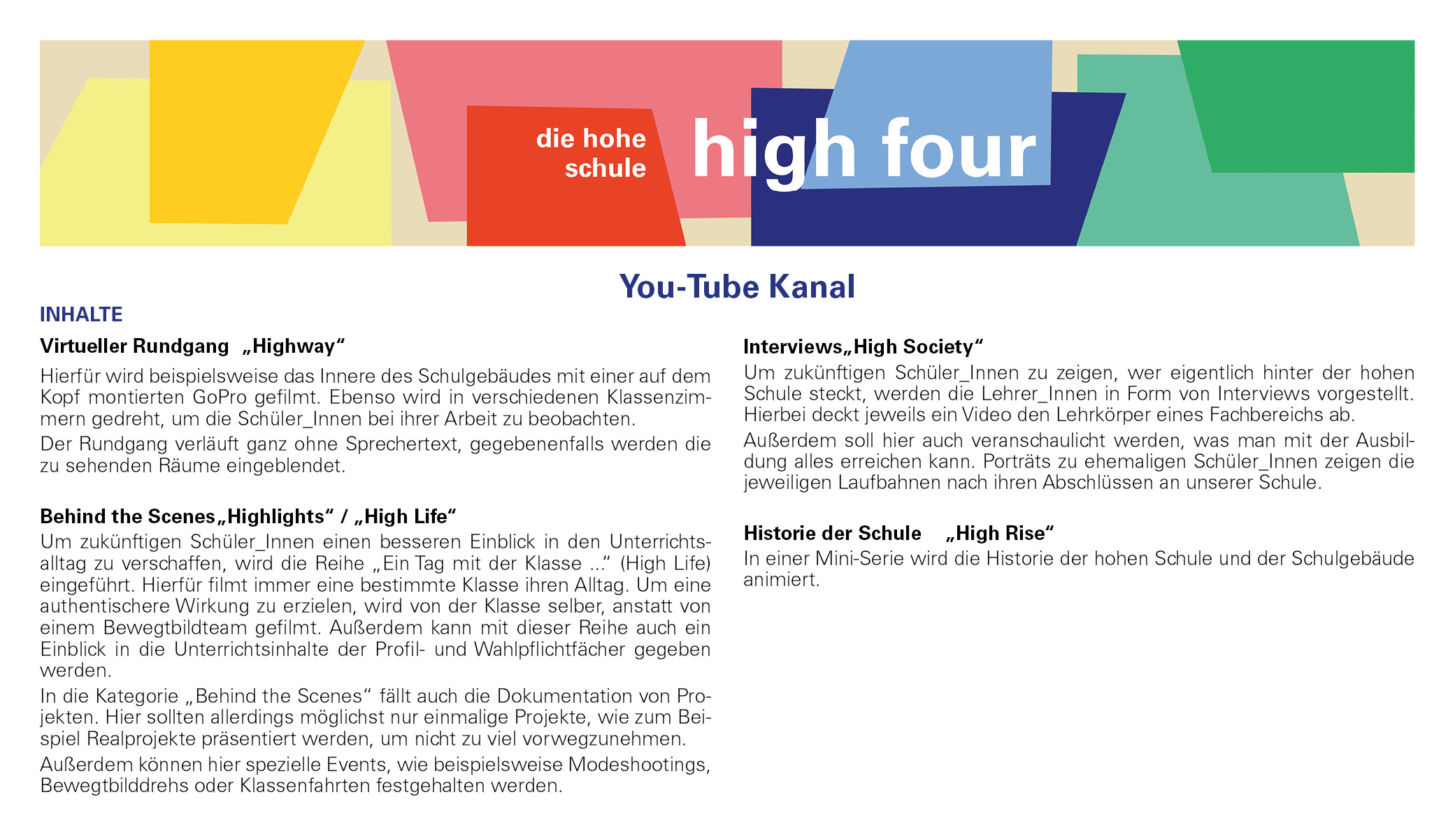 Es wird ein YouTube-Kanal eingeführt, der einige Insights/Insides zeigt. Er soll v.a. zukünftigen Schüler_Innen die Familiarität und Offenheit an unserer Schule vermitteln. Angelehnt an „Die hohe Schule“ heißt der Kanal „high four“.