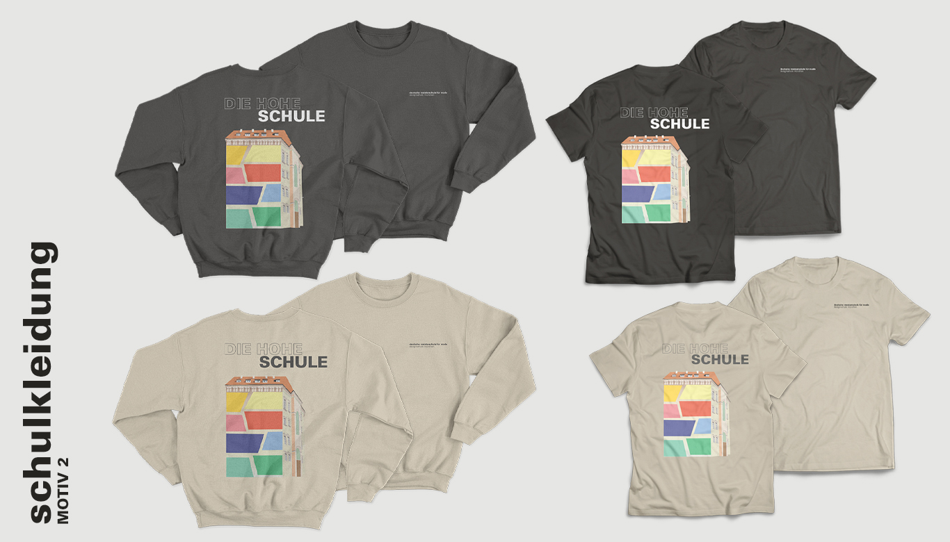 Schul-Shirts mit einem hohen Schulhaus als Motiv sollen Identifikation schaffen und Zusammengehörigkeit zeigen.